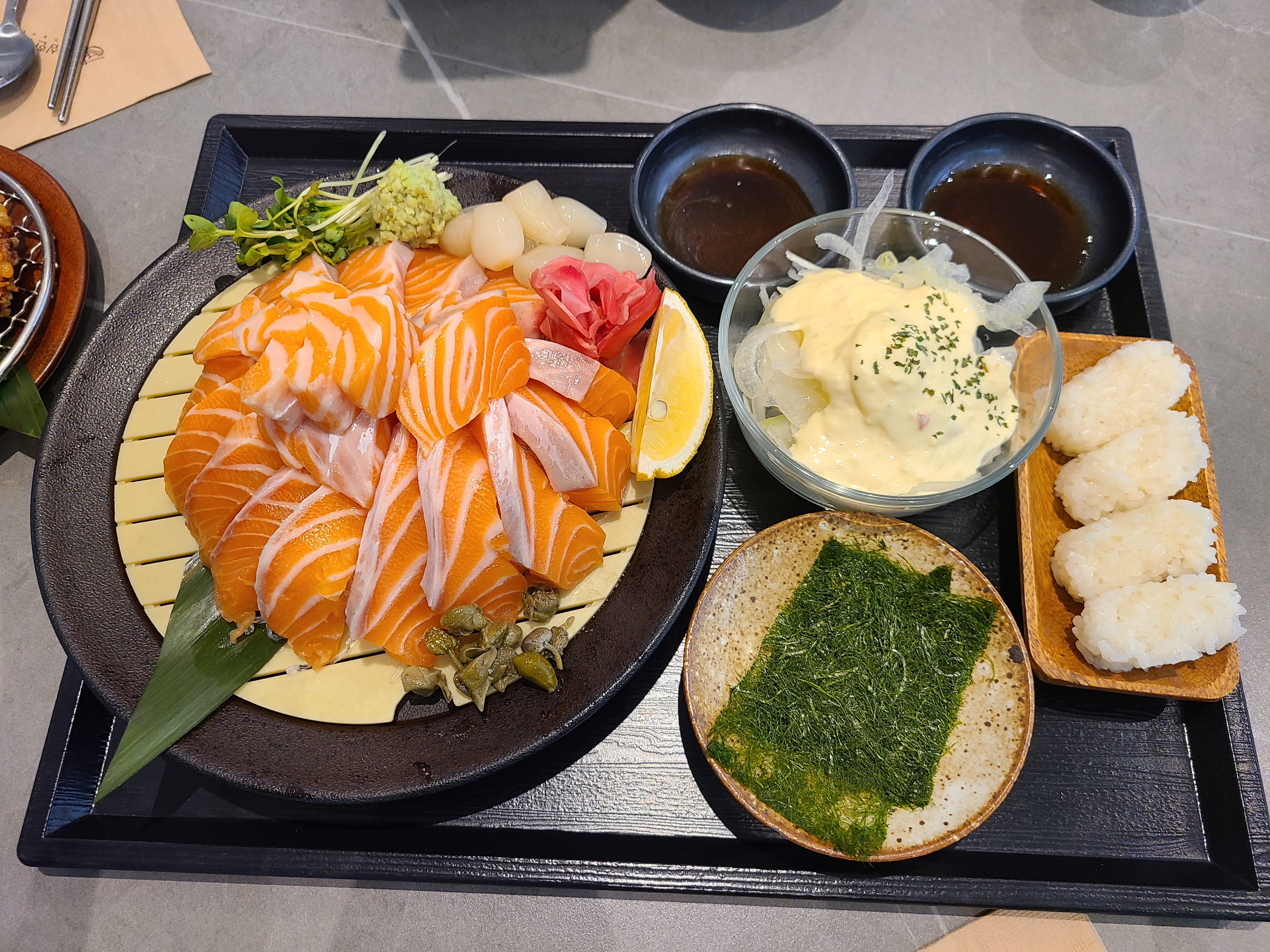 우리의 오늘 목표 연어사시미! 저 영롱한 색 어떡할거야ㅠㅠ 윤기가 좔좔. 접시에 연어가 뛰어다니는 느낌이다. 세상에.. 먹기 전에 얼른 사진 몇 장 찍고 입에 한가득 옴뇸뇸 하고 싶은 비주얼이었다.