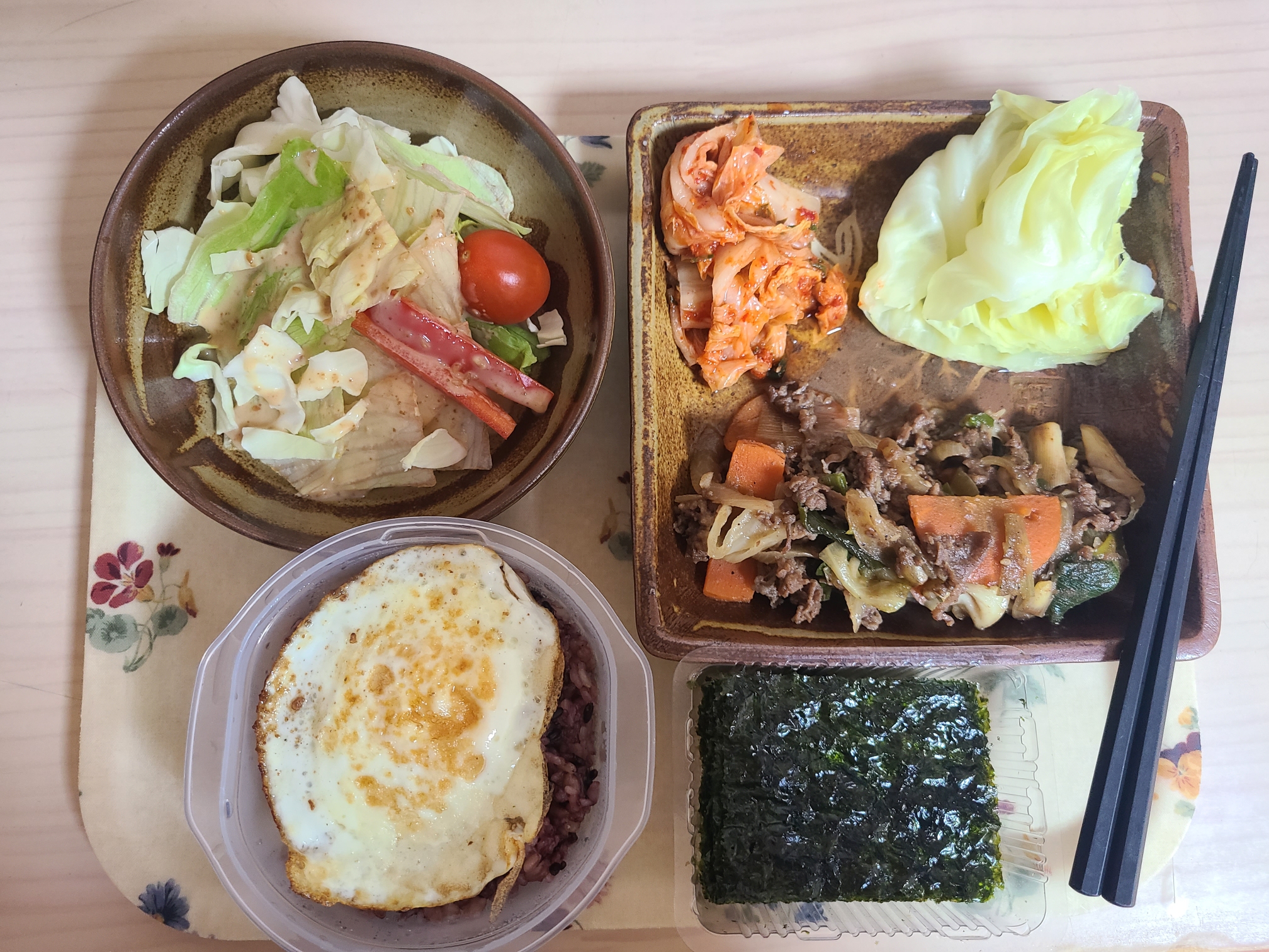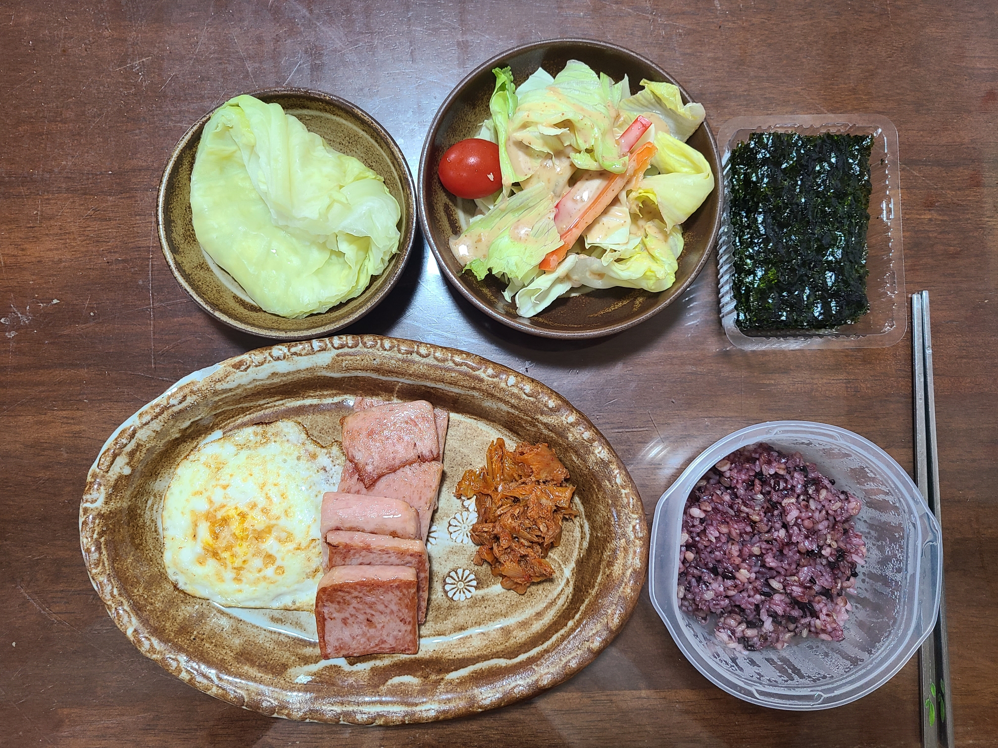 이 날은 남은 불고기를 다 털어버린 날. 불고기도 양배추랑 싸먹었는데 아주 좋았다. 짜지도 않고, 더 건강하게 먹는 느낌이랄까. 접시 아끼려고 계란은 밥 위에 올려뒀다. 역시 설거지거리는 적게, 양분은 다양하게 먹는 게 최고다!