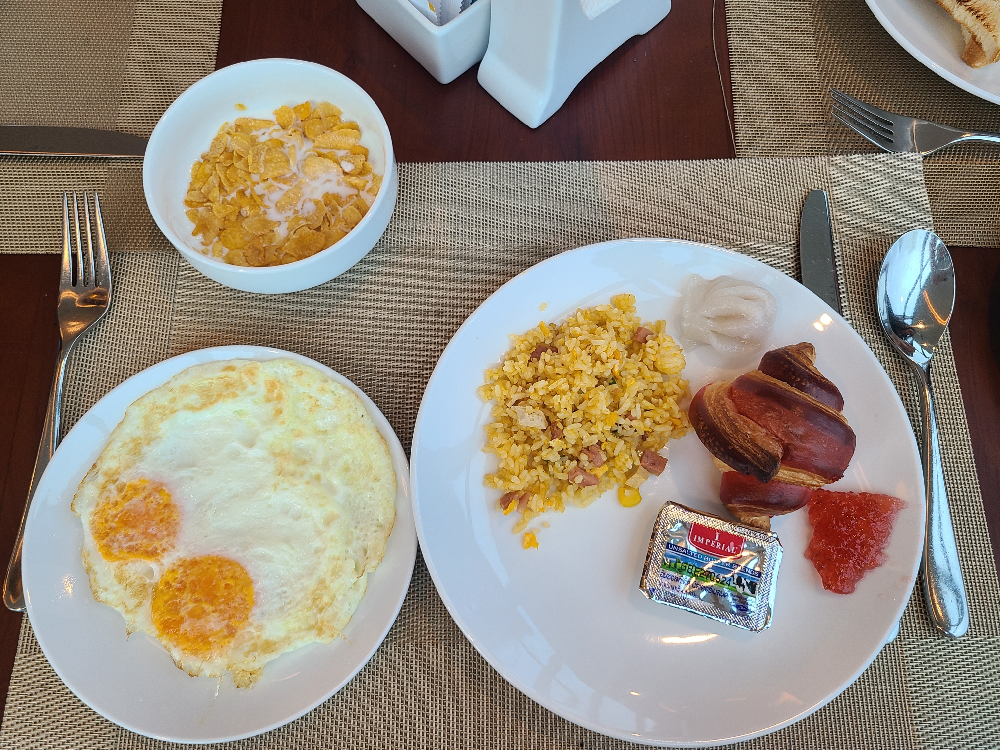 짠! 첫날의 조식. 뭘 먹을까 고민했다. 개인적으로 손이 가는 음식이 엄-청 많은 건 아니었는데(기대하지 말라던 블로거님들의 의견에 동의한다) 그래도 무난한 편. 콘푸라이트는 공기가 꽤 들어가서 눅눅했다. 계란밥(?) 이랑 빵 한조각, 계란후라이 하나(그래도 쌍란이다)면 조식으로는 충분하다고 생각한다.